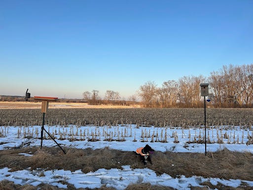 Just a few days after I put up the crow feeding station with the trail cam - I caught a little flash of something. I had to zoom in to see it wasβ¦an Eastern Bluebird! And when I looked even closer there was a second one flying over the corn stubble too.