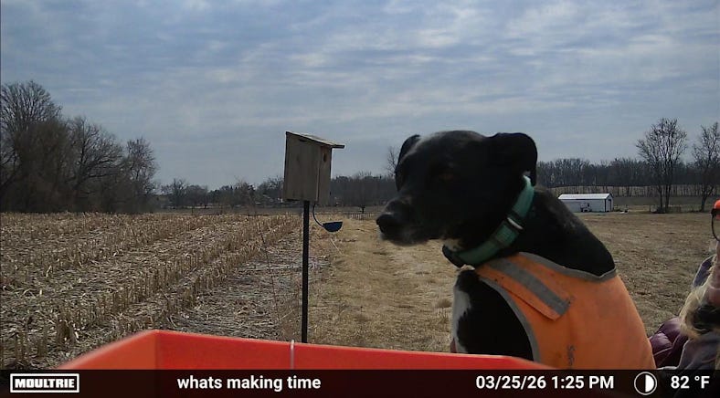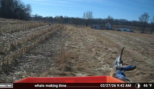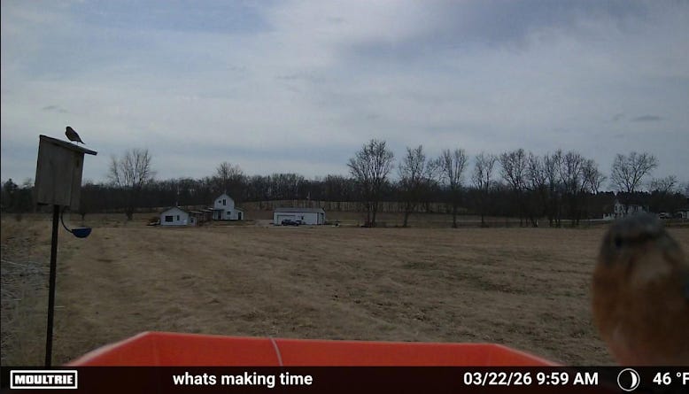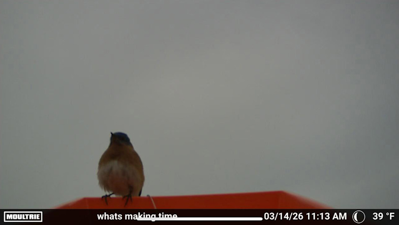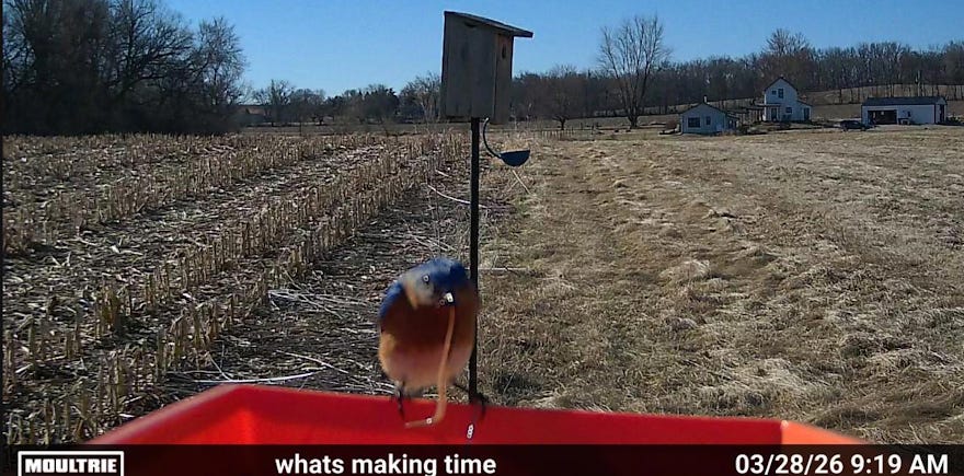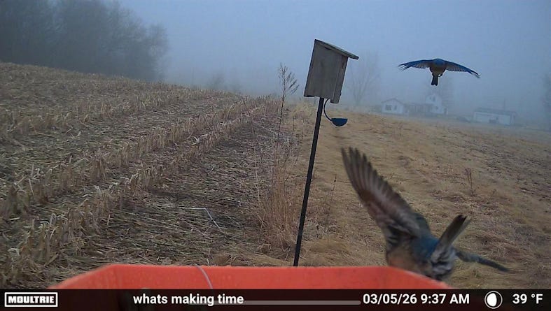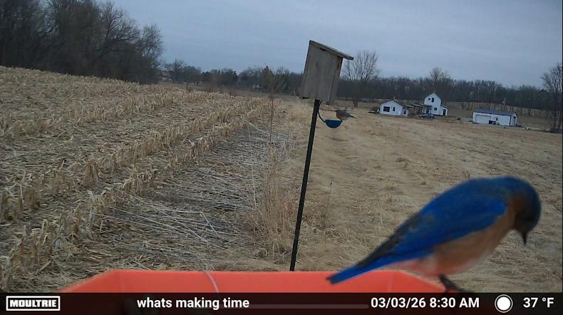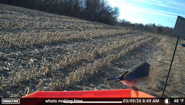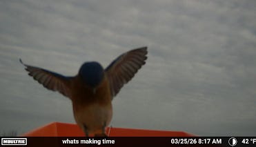 We have Bluebirds here. They stay here year round, which makes me feel special (most of them migrate away for winter). We have two Bluebird houses up, but they are often taken over by house sparrows. (Gross). Iβve never caught a bird on the trail cam in the field before, but mostly because thereβs never been any sort of platform for a bird to perch on.