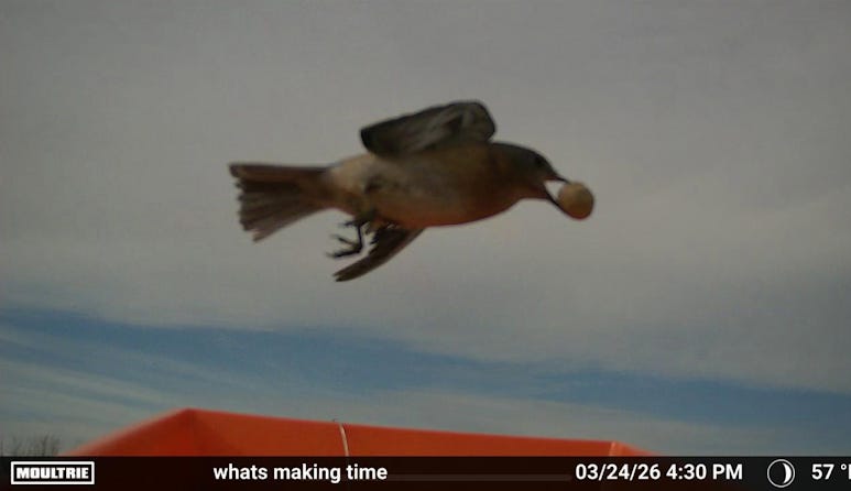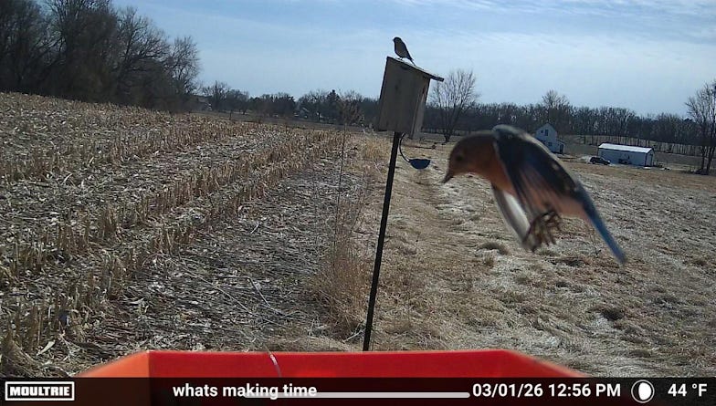 As of a few days ago, there was still no nest material in the house. In theory, they start nesting in mid-late March. But when I came out one day this week there were at least four Bluebirds that scattered from around the house and crow feeder when I walked up. Bluebirds are super territorial. Aggressively so. If I canβt have this house, NOBODY CAN! So I think they just all try to scare each other way - all the time. I hope someone moves in soon. And get left alone!