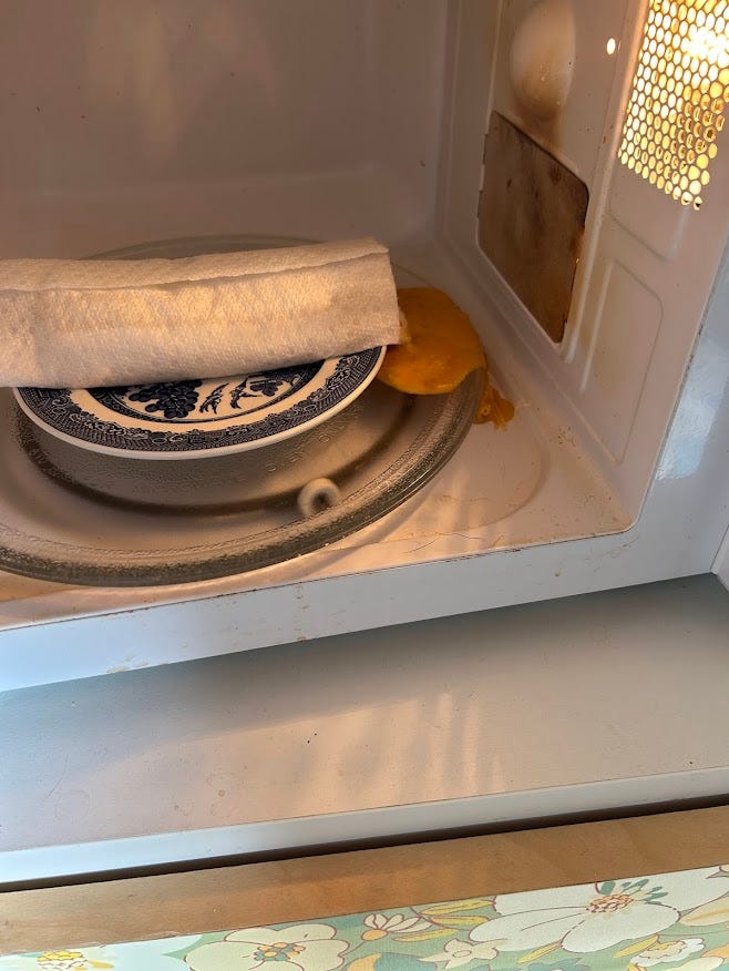 I like to eat frozen burritos when I work on house projects. Warm and cheesy and satisfying and limit my ability to get distracted. I forget, however, they have a tendency to throw up in the microwave. Blurp.