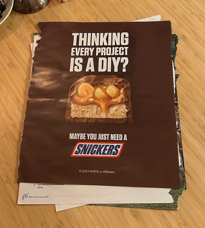Last weekend I cleaned off my desk and tried to clean out parts of my studio/office. This included a 2023 issue of Better Homes & Gardens. This add was toward the back. I was flipping through it after M was asleep. I laughed so hard I thought I might wake her up. I think I might have to frame this and put it in a prominent location.