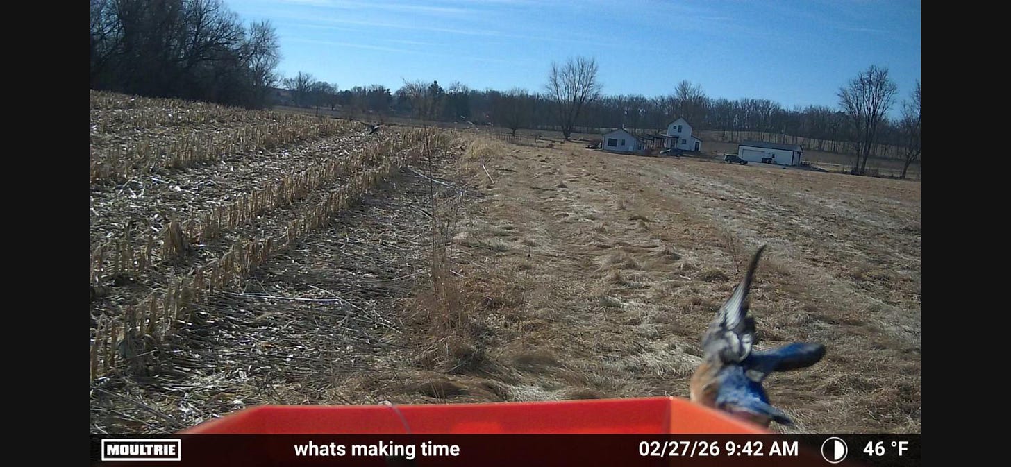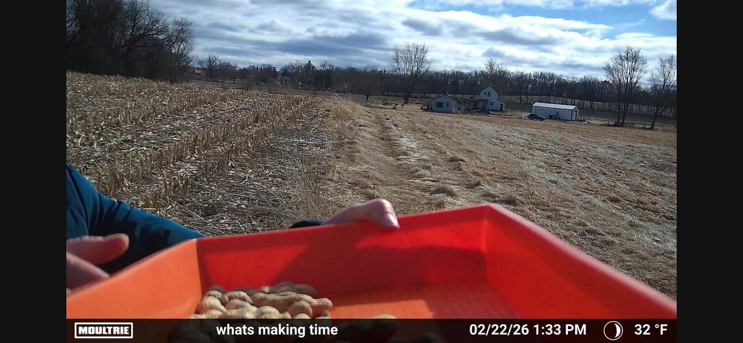 Of course, I didn’t take any photos of the get up on the t-post out in the wild (it was windy and really cold). But I did sash the trail cam on the set up and it caught this photo of me adjusting the tray.
